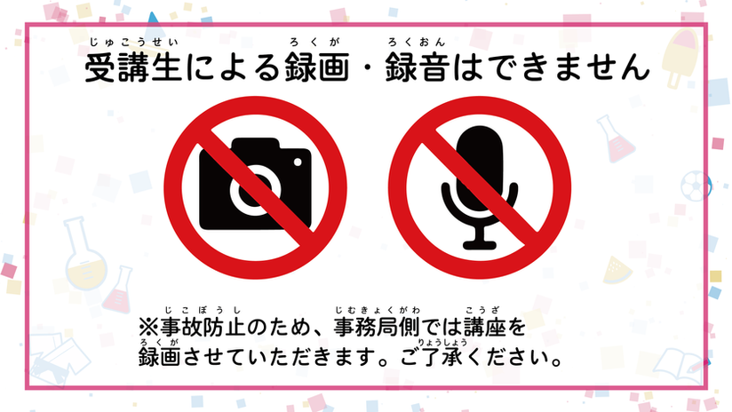 講座案内メール(講座のZoomのURLが記載されたもの)は9/26(土)中に配信の予定です。9/26(土)の夕方になってもメールが届かない場合は、ご登録いただいたアドレスに間違いがあるか、受信拒否設定がされている可能性があります。その際はお手数ですが事務局までご連絡をお願いいたします。